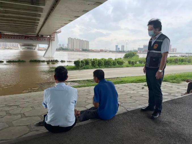 6月21日上午11时,三水区西南街道正在沿涌堤围巡查。陈健欣、林蔚坚/摄三水提醒市民,各职能部门将加强河涌水面巡查,请渔民不要擅自出行。区城管执法部门将同各镇(街道)采取拉警戒带、设置围栏等措施,对沿涌公园及低洼区域进行安全管控,对水浸区域将全部采取停电措施,停止一切亲水活动,对沿河涌钓鱼、抓鱼群众及时进行劝导,请群众不要进入上述危险区域。