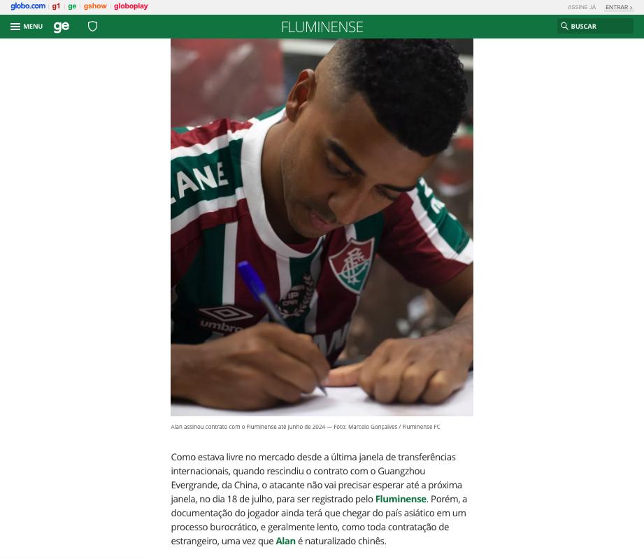 北京时间6月22日上午,巴甲俱乐部弗鲁米嫩塞官方宣布,入籍球员、前广州队前锋阿兰正式加盟球队,双方签约至2024年。