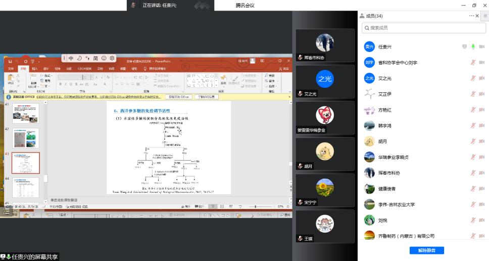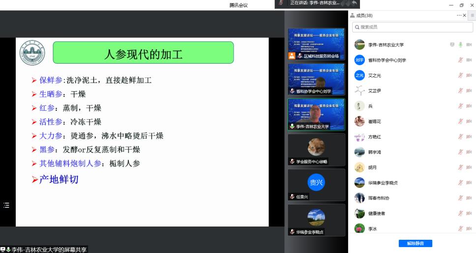 助力人参产业高质量发展专场由“科创中国”吉林区域科技服务团、珲春市科学技术协会、长春生命健康产业研究院承办,邀请中国农业科学院作物科学研究所研究员任贵兴和吉林农业大学中药材学院副院长、教授李伟分别作《稀有人参皂甙规模化制备(公斤级)及抑菌活性研究》和《人参加工技术与应用》专题报告。任贵兴的报告以人参属植物皂苷抑菌及多糖免疫活性研究为核心,介绍植物低极性皂苷对食源性致病菌等的抑制作用、西洋参多糖免疫活性和桔梗皂苷解酒作用的研究,讲授了常规皂苷到低极性皂苷的转化制备方法;李伟介绍了人参加工的历史沿革和主要加工技术,对中韩在人参加工技术和产品开发上的差异进行比较,着重讲解了人参在加工过程中的化学转化和人参主要药理活性研究进展。