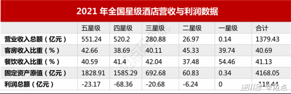 日前,中国文化和旅游部发布《2021年度全国星级饭店统计调查报告》,数据显示,从经营状况来看,2021年度全国星级饭店总营业收入总额为1379.43亿元,其中客房占营业收入的40.69%,餐饮占营业收入比重的41.13%,但利润总额合计为-118.44亿元。