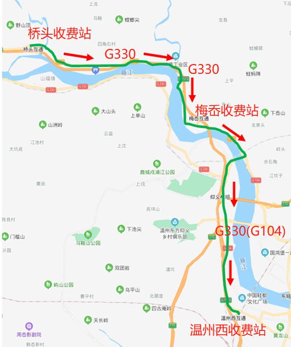 ▲经G1513温丽高速往温州方向的车辆,从桥头分流点下高速,走地方道路经333省道-330国道-104国道至温州西或瓯北收费站上高速。
