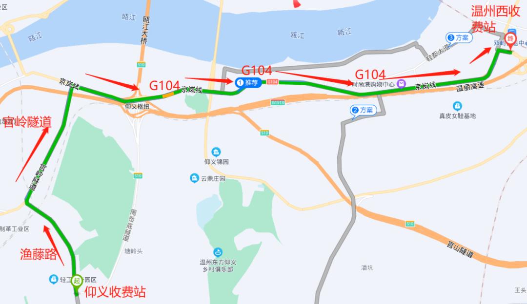 温州绕城高速仰义收费站至温州西收费站绕行线路图