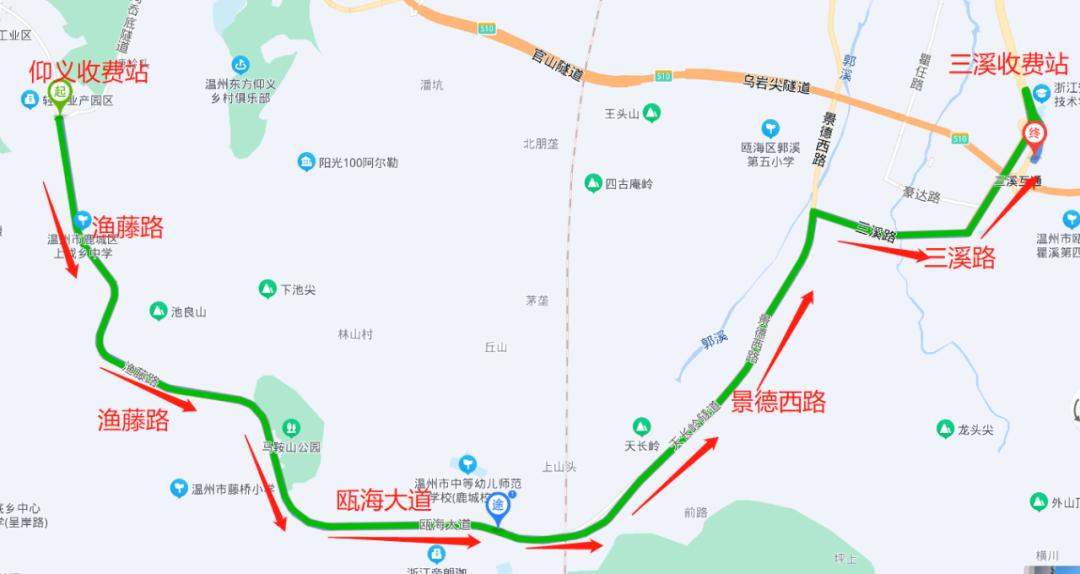 ▲或走地方道路经渔藤路-瓯海大道-天长岭隧道-景德西路-三溪路-瓯海大道至三溪收费站上高速;
