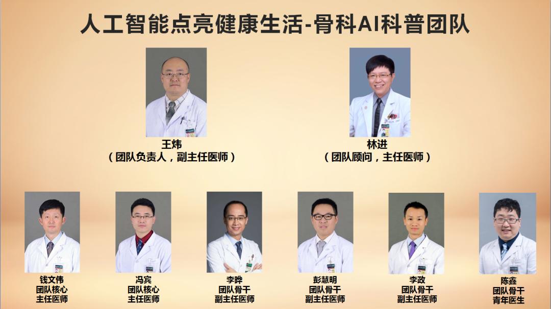 人工智能点亮健康生活-骨科AI科普团队北京协和医院“人工智能点亮健康生活-骨科AI科普团队”将以骨关节健康为切入点探索切实可行且高效的科普传播路径,培育专业化科普团队、构建标准化科普传播平台,拓展相关传播领域并向骨科全领域疾病辐射,打造具有协和特色的多学科智能医学传播平台。
