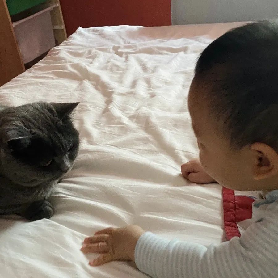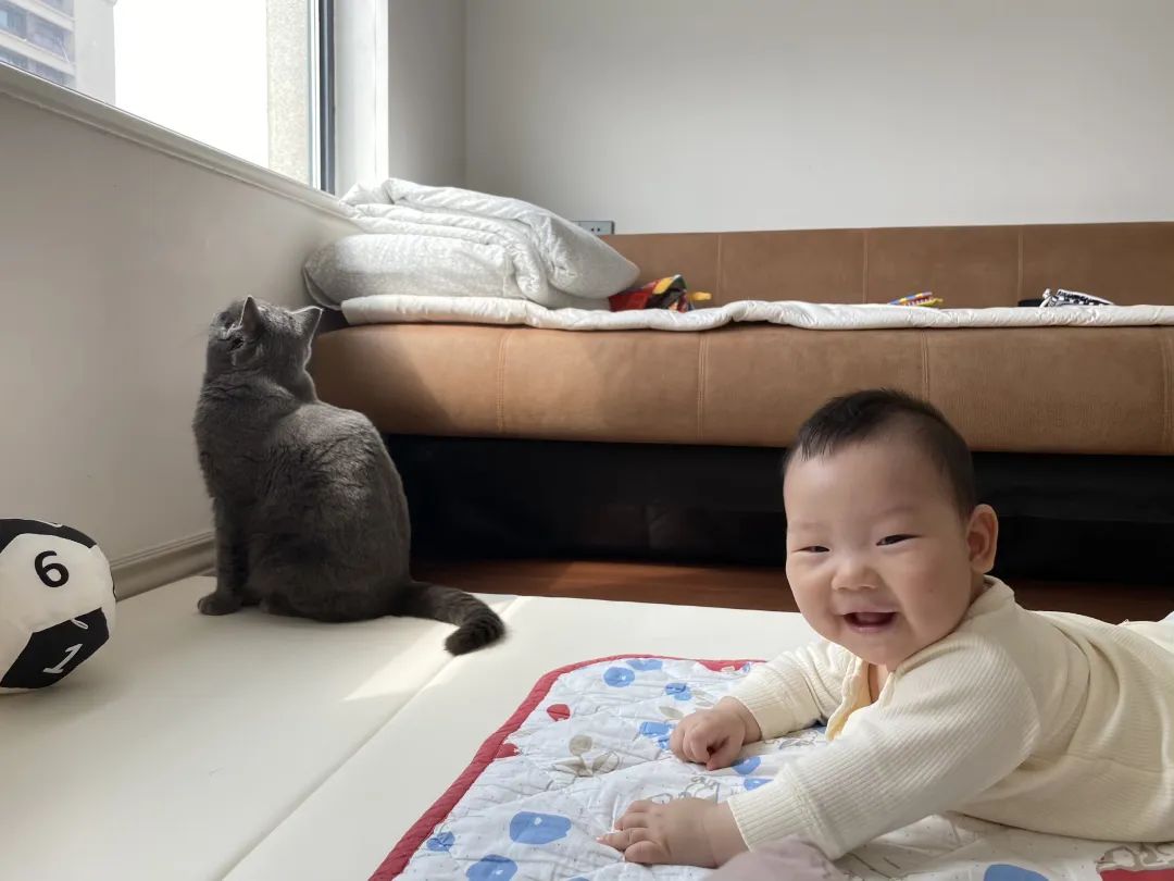 多多一看到猫咪就会笑的很开心,克拉在我陪多多玩的时候,也想加入我们的感觉!