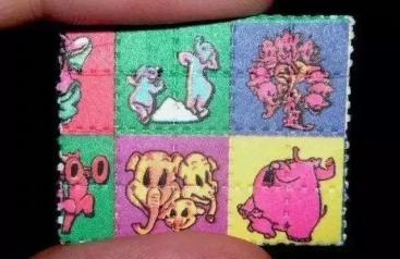 注意了!这些邮票式样的贴纸可能是贩毒人员将毒品喷在上面或是泡在溶液里做成的,他的主要成分是“麦角二乙胺”(LSD),一种强效的致幻剂。只要把他贴在皮肤或含在嘴里,人体就能吸收有毒物质,使用后会心跳加速、血压升高,并出现急性精神分裂症状,极其危险。