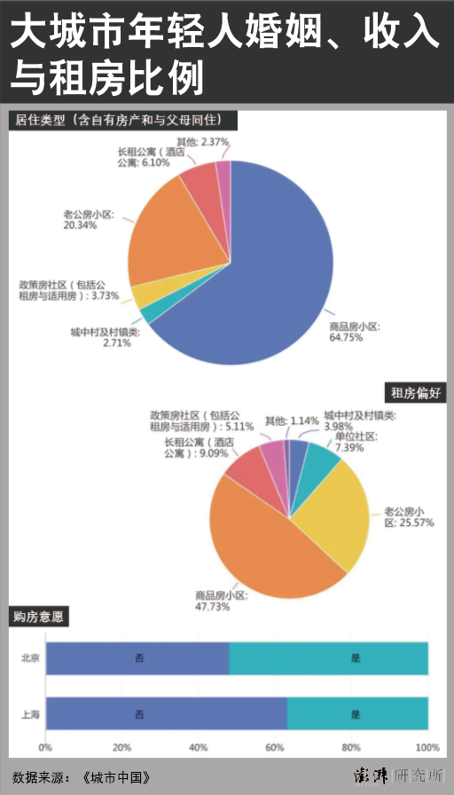 而在2021年夏,《城市中国》杂志也通过调查问卷的方式描绘出中国居住于一线城市的年轻人(其中50%为26-30岁,30%为31-40岁,18-25岁约20%)在婚姻、收入、租/买房偏好的特点,最终也得出了类似的结论。