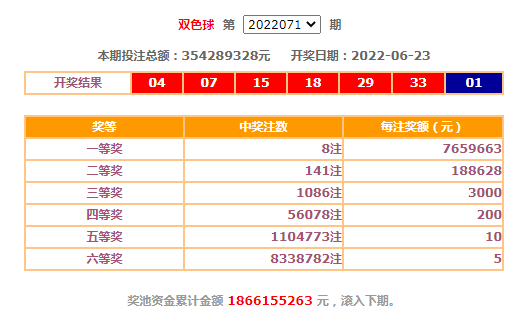6月23日晚,中国福利彩票双色球游戏第2022071期开奖,红球号码为04、07、15、18、29、33,蓝球号码为01。