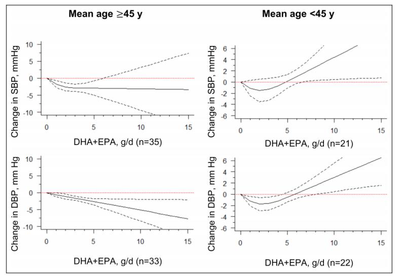 图8 DHA+EPA摄入与血压降低之间的估计平均剂量-反应关系在SBP和DBP模型中,DHA+EPA与血压降低之间的线性偏差可忽略不计,似乎仅限于≥45岁,而对平均年龄<45岁的患者无效(图9)。