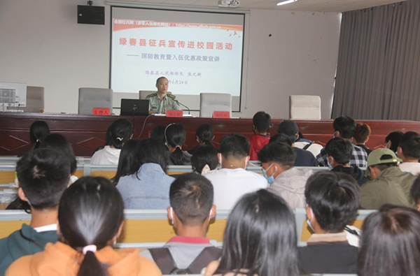 为激发广大适龄青年的参军热情,近日,绿春县征兵办抓住绿春县高级中学高三学生回校填报高考志愿的契机,到学校开展“征兵宣传进校园——国防教育暨入伍优惠政策宣讲”活动。