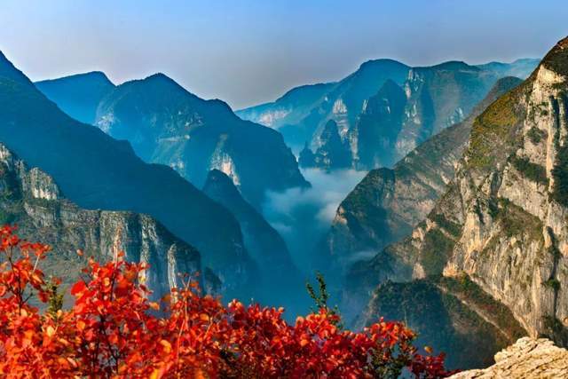 巫峡•神女景区中有巫峡“十二峰”“世外桃源”“神女溪”等奇山异水,亦有10平方公里的高峡平湖,更有“旦为朝云,暮为行雨”的巫山云景,秋天神女峰、净坛峰、飞凤峰有10万余亩的红叶。