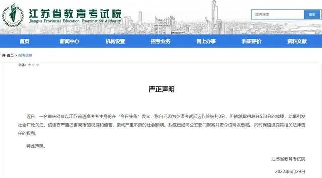 原标题:《高考英语0分总分533分?江苏:已报案》