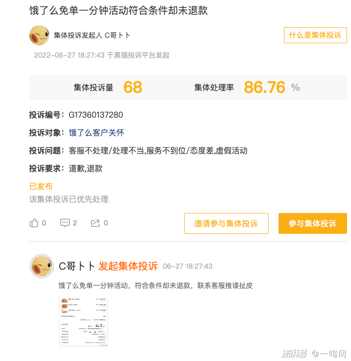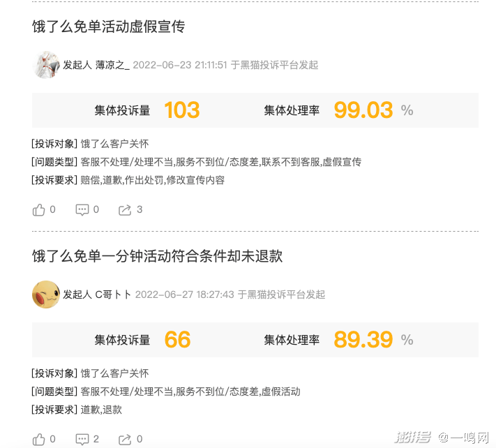 据小柴在黑猫投诉发现,关于饿了么免单活动,目前有两个集体投诉案例。