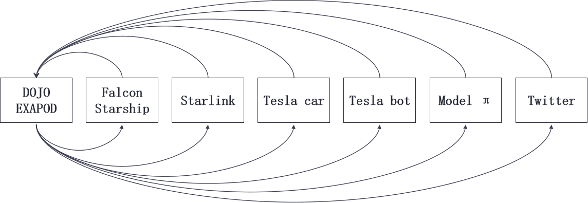 其产业链企业,从左到右依次是,“道场”百亿亿次超级计算机、猎鹰火箭及星舰运载器、星链低轨互联网星座系统、特斯拉汽车、特斯拉人形机器人、Model π智能手机和推特。他用自己的火箭发射自己的卫星、用自己的卫星连接服务自己的汽车和手机、用自己的机器人和手机增强自己的汽车、用自己的“媒体”宣传自己、用自己的超级计算机为自己的箭、星、车、机器人、手机和媒体训练神经网络模型以不断提高其智能水平,并快速循环迭代。目前看来,这种模式是成功的。