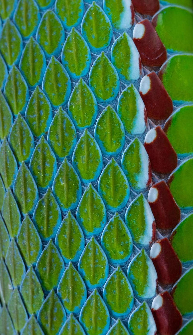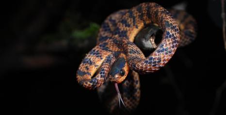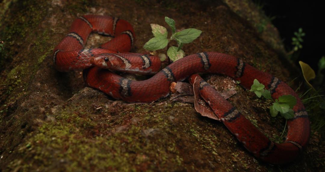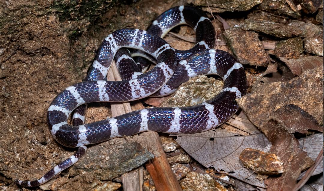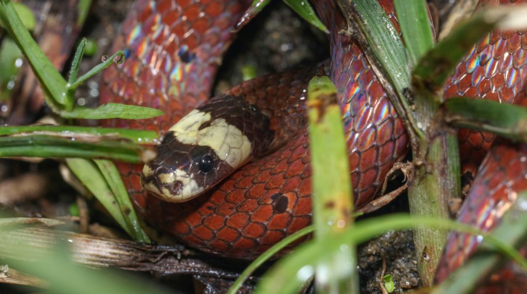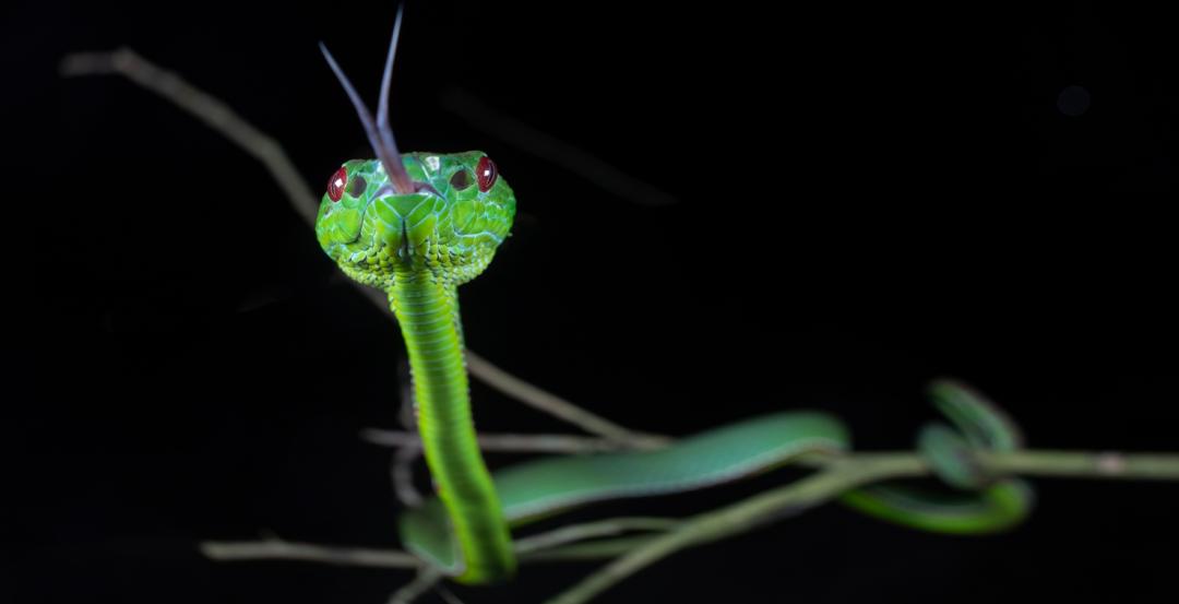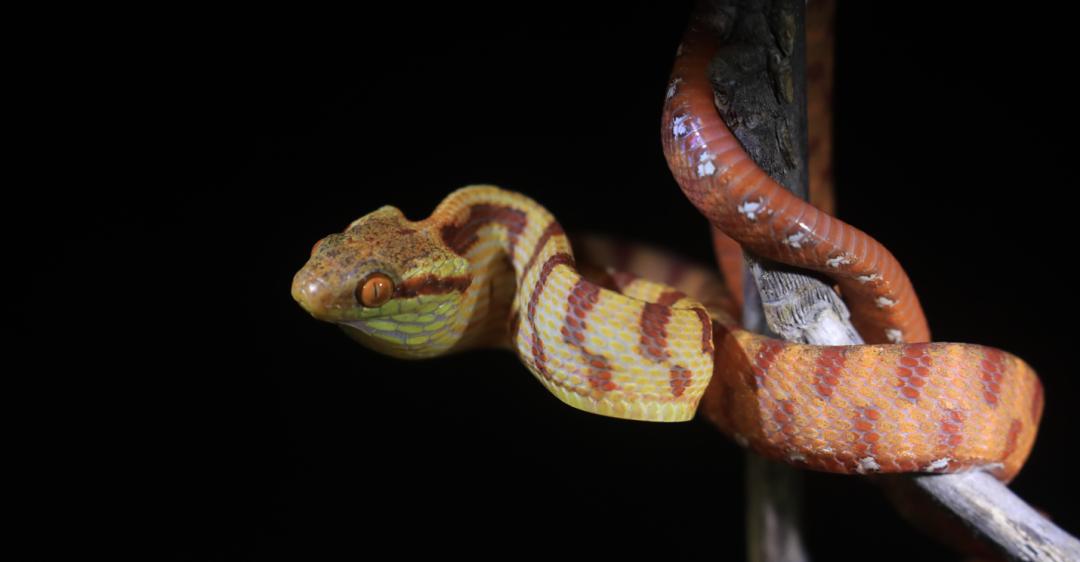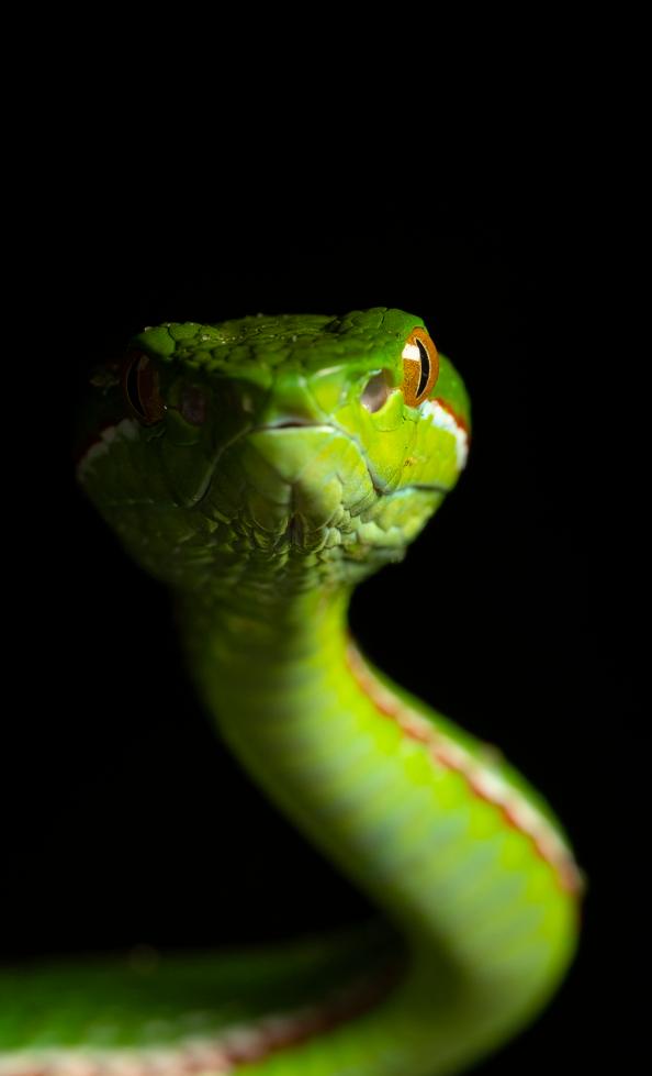 2019年确定命名的蝰科竹叶青属一新种,发现地位于云南省盈江县境内。鳞片边缘有着与众不同的蓝色。雄性红白相间侧鳞和红色瞳孔,使其显得格外冷酷又美丽。摄影:曾祥乐