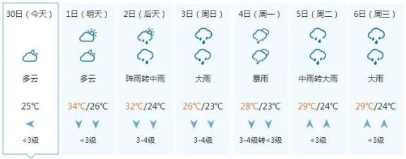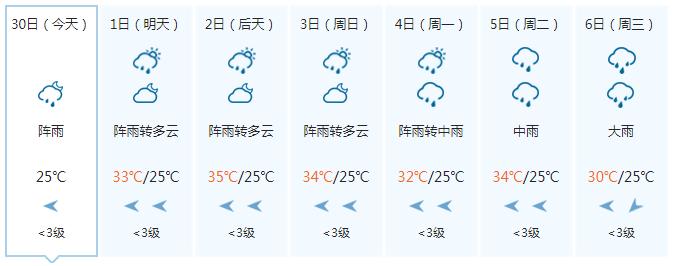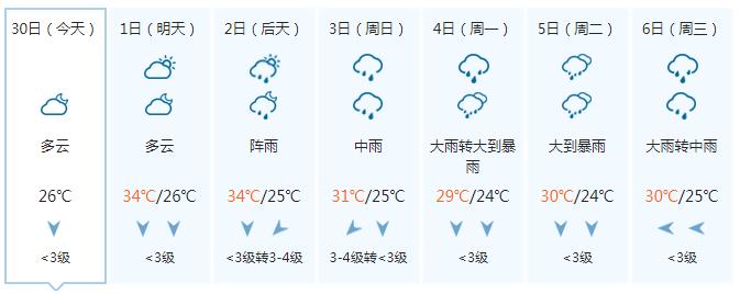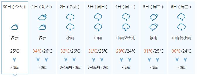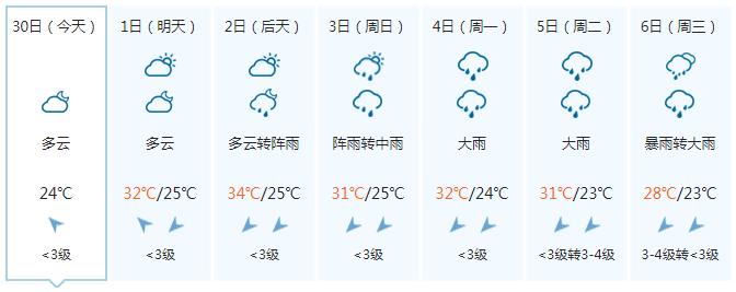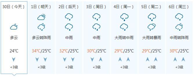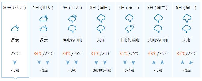 南宁市:今天晚上多云,明天白天多云,局地有阵雨或雷雨,偏东风1~2级,最低气温25℃,最高气温34℃。