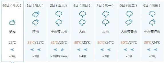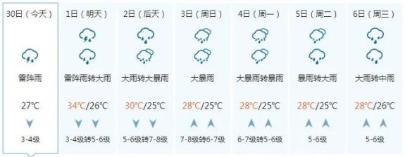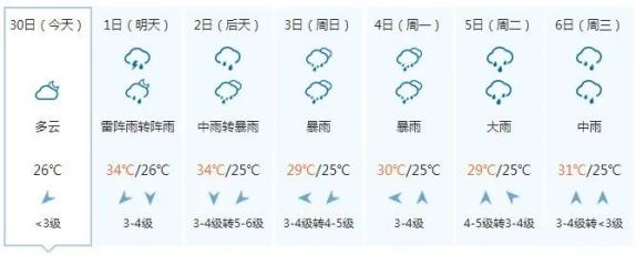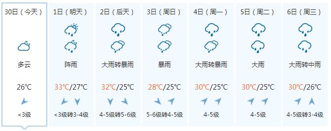 7月5-7日,大雨到暴雨,西南风5~6级,阵风7~8级。