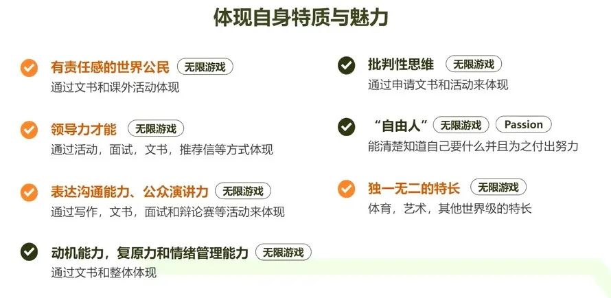 还有一些是动机复原力和情绪管理能力,这些就是写文书里边的素材了。比如有孩子写自己家庭破碎,出现了心理上的变化,自己如何抑郁,然后自我救赎,想要救更多抑郁的青少年,然后参加了这方面的活动,还通过自己的一个发明研究了音乐,通过不同音乐的音频让抑郁的孩子得到缓和。这样的活动、竞赛、论文,最后申请到了顶尖名校是无法作假的。这里面呈现了一个很重要的能力,就是情绪管理能力和复原力,这是顶尖名校非常想要的。