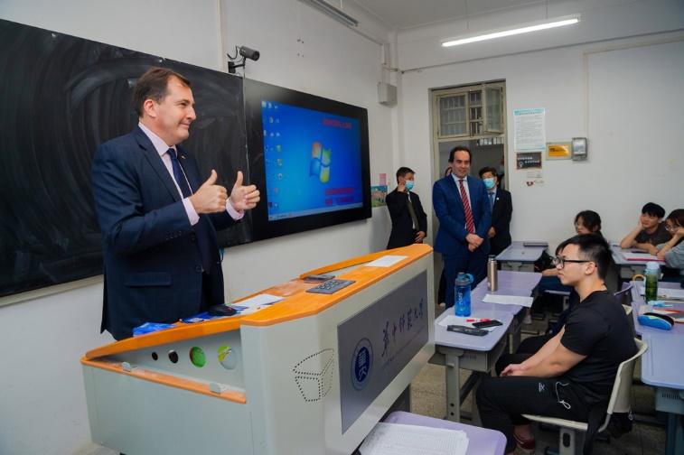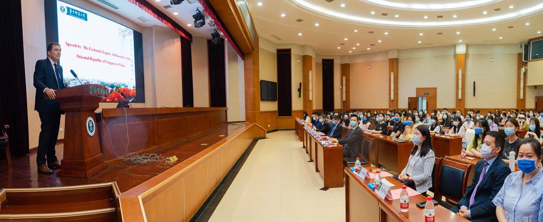2021年5月,乌拉圭驻华大使费尔南多·卢格里斯和乌拉圭驻上海总领事莱昂纳多·奥利维拉·德·安德烈来校访问。访问期间,大使团一行走进西班牙语课堂,费尔南多·卢格里斯向同学们介绍了乌拉圭的风土人情和足球文化。多措并举拓宽学生国际视野,也是西班牙语系人才培养的关键一环。