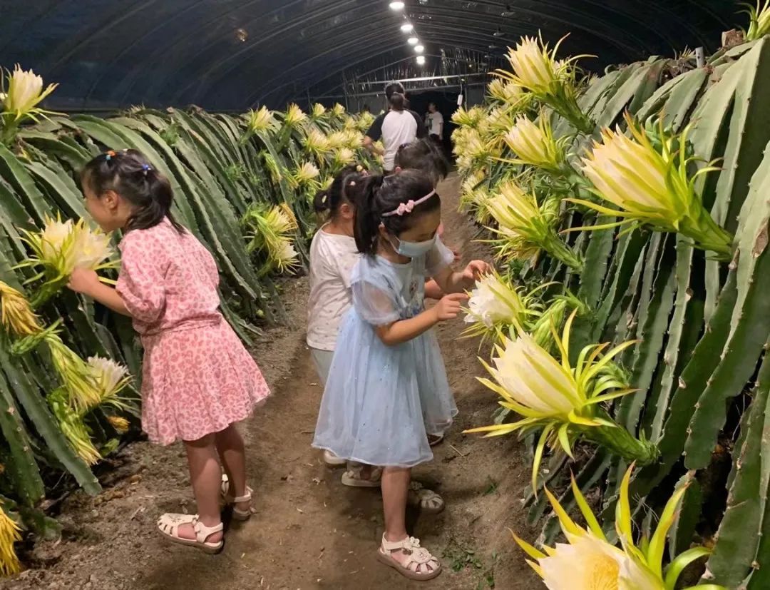 “这花真好玩,晃来晃去的,好像果冻呀!”“妈妈,你看‘仙人掌’上的刺,像不像蜗牛的触角?”6岁半的陈嘉欣和4岁的果果,在家长的带领下来到采摘园游玩,看到盛开的火龙果花时兴奋不已,开怀地在棚里奔跑,不时捧起花朵,摸一摸、闻一闻,满怀好奇。成年游客也被眼前的花朵吸引,纷纷拿出手机拍照留念,记录下这不常见的画面。