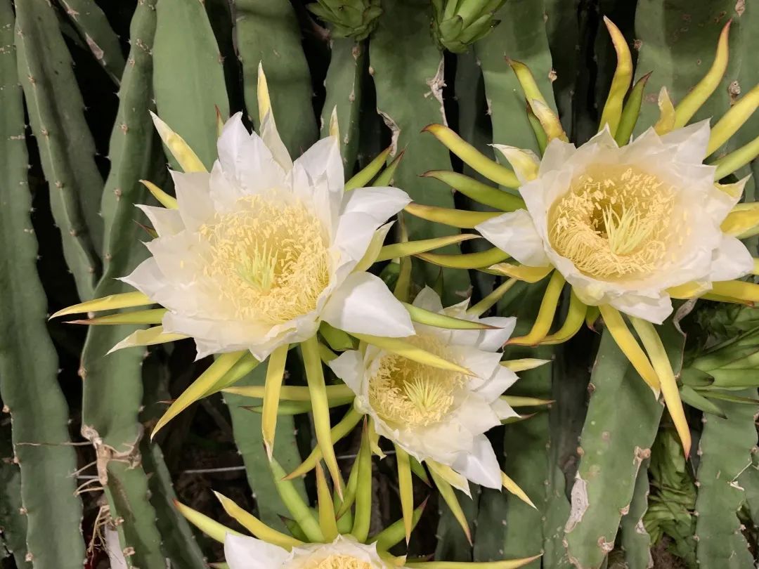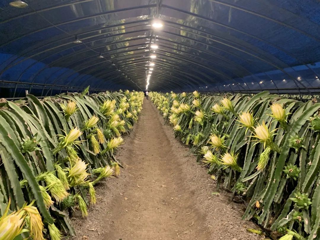 傍晚时分,走进采摘园,首先映入眼帘的是一排排形似仙人掌的枝茎,一朵朵火龙果花点缀其上,黄绿色的花萼半收拢着花蕾,显露出含苞待放之态。随着时间流逝,洁白的花瓣缓缓舒展开来,露出淡黄色的丝状花蕊,空气中也随之暗香涌动。