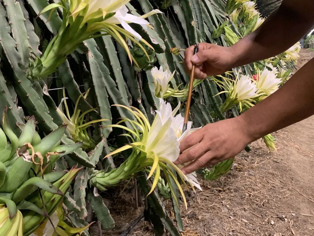 趁花朵在夜间盛开时,采摘园负责人谭安福拿着软毛刷,将“台湾大红”火龙果的花粉扫进盒子里,再轻轻点沾在“红水晶”火龙果的花蕊上,如此反复。原来,由于个别品种的火龙果花不具备自然授粉的条件,需要通过人工辅助授粉,以提高火龙果的坐果率。