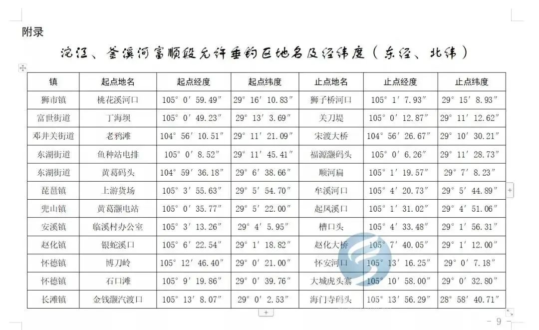 富顺县沱江和釜溪河允许垂钓区如下表所示。除沱江、釜溪河、镇溪河以及其他法律法规规定的不可垂钓区外的其他小河流均可垂钓。