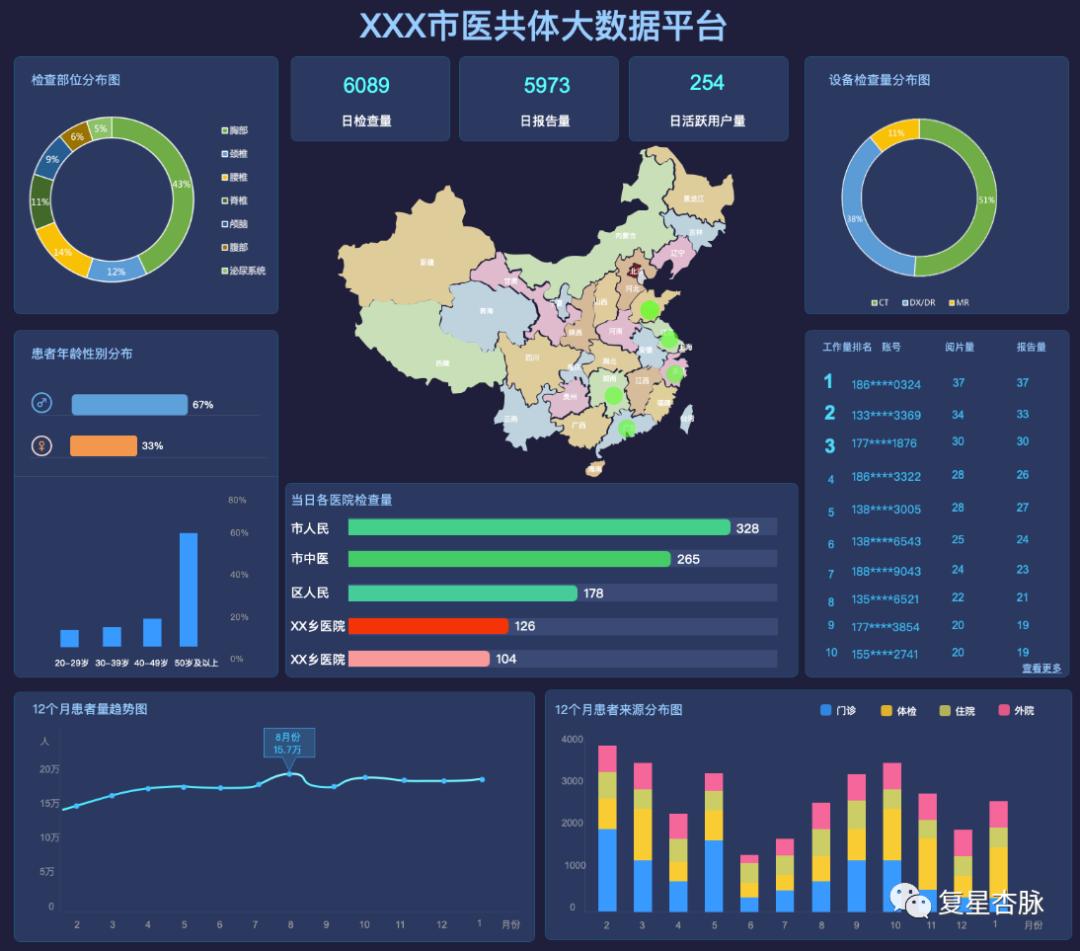 复星杏脉医联医共体解决方案采用矩阵化建设,目前覆盖全影像链的区域一体化云建设及人工智能布局的解决方案,解决方案主要包括放射影像云中心及人工智能分析平台、超声影像云中心及人工智能分析平台、病理影像云中心及人工智能分析平台、云心电分析中心、区域病历信息交互中心、实时远程会诊中心、MDT 门诊中心、疑难病诊治中心、影像链云质控中心、数字云胶片中心、远程教育及培训中心、以及科研转化中心。矩阵化的医联医共体的建设,将遵循“整体规划、统一标准、专业运营、分步实施”的原则,计划联合区县内各级医院,实现影像、超声、病理、心电以及病例信息的互联、互通,专业化运营管理,统一、规范的质控管理标准,共同提升成员医院的临床诊断水平、学科建设、人才梯队培养和科研能力等,造福广大患者。