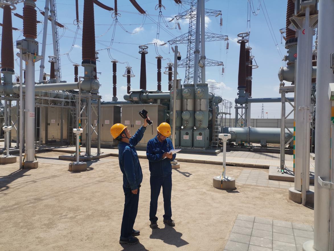 6月20日,兰州公司变电运维中心新区运维班的技术员高振元和同事,对110千伏周家庄变电站设备进行测温。王志童 摄