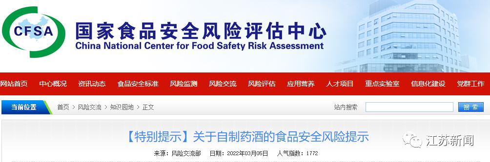 为减少饮用自制酒的食品安全风险,国家食品安全风险评估中心曾多次提示公众:不配制、不饮用自制酒!尤其是乌头碱类药物、马钱子、含有虫类的一些毒副作用的药材,要谨慎使用!