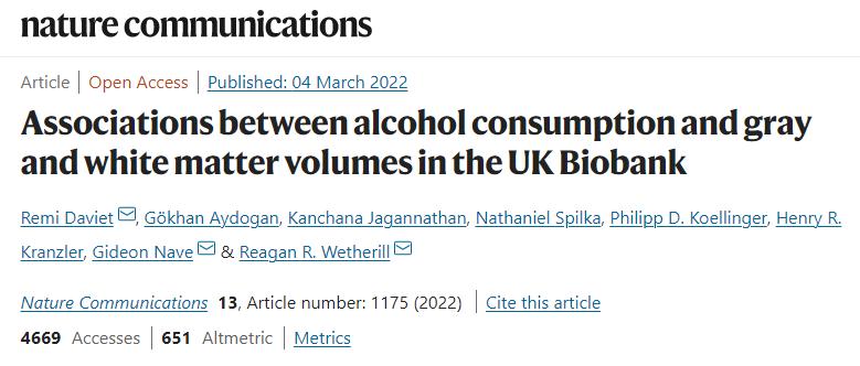2022年3月,美国宾夕法尼亚大学的研究人员在《自然》(Nature)杂志子刊《自然·通讯》期刊上发表了一篇题为《酒精消耗量与灰质和白质体积之间的关系》的研究。