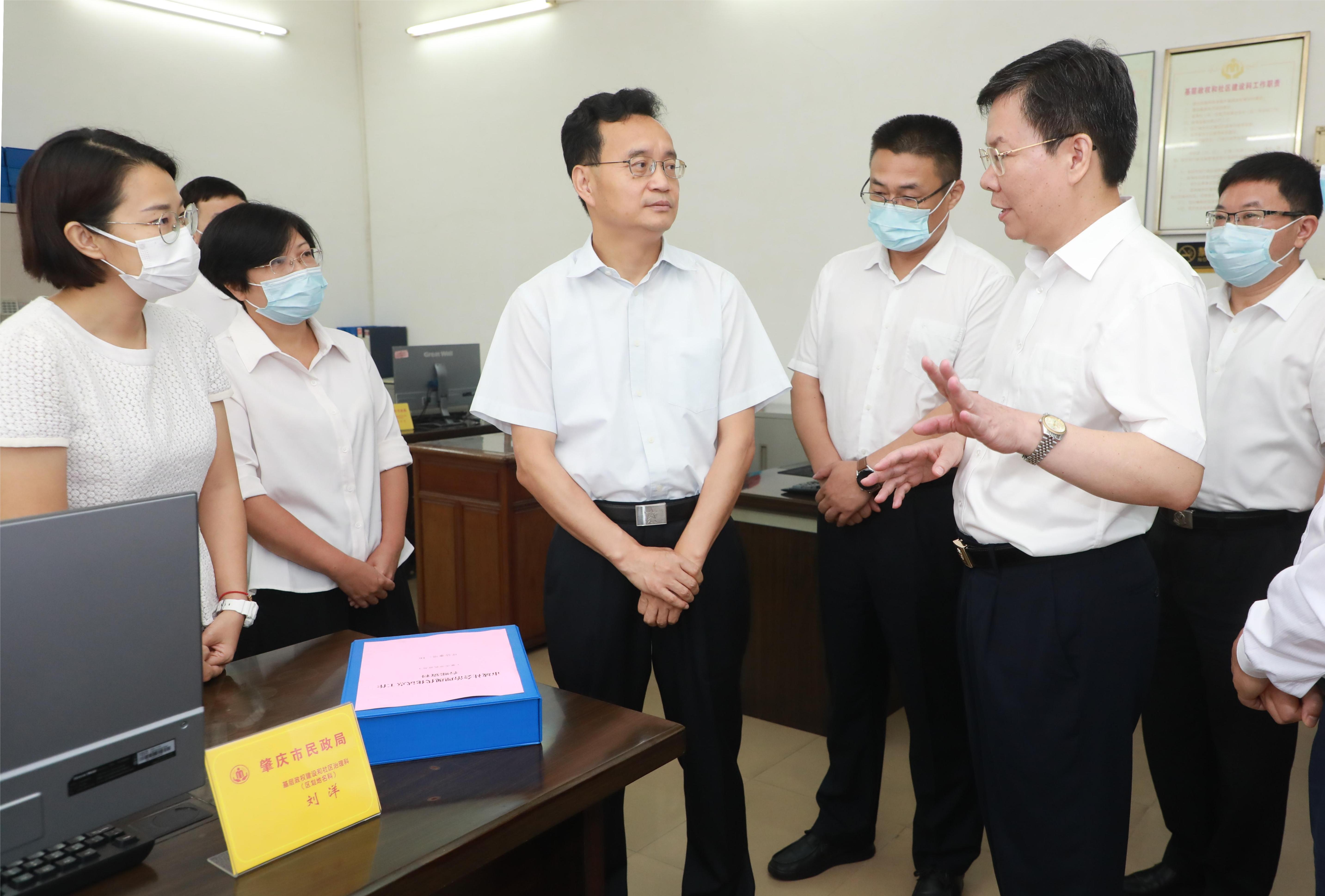 △7月7日,张爱军到市民政局调研并召开巡察情况反馈座谈会。西江日报记者 刘春林 摄在市民政局,张爱军走访看望有关科室干部职工,听取有关工作情况汇报,要求大家树牢“民政为民、民政爱民”的工作理念,结合“我为肇庆抓发展”任务清单,以项目化工作法切实抓好社会救助、儿童福利、养老服务、基本公共服务、民政服务设施建设等工作,特别是要加强对孤寡老人、孤儿、病重人员、低保人员、残疾人、流浪乞讨人员等各类保障群体的关爱帮扶,用心用情用力做好民生保障工作,让广大人民群众共享改革发展成果。