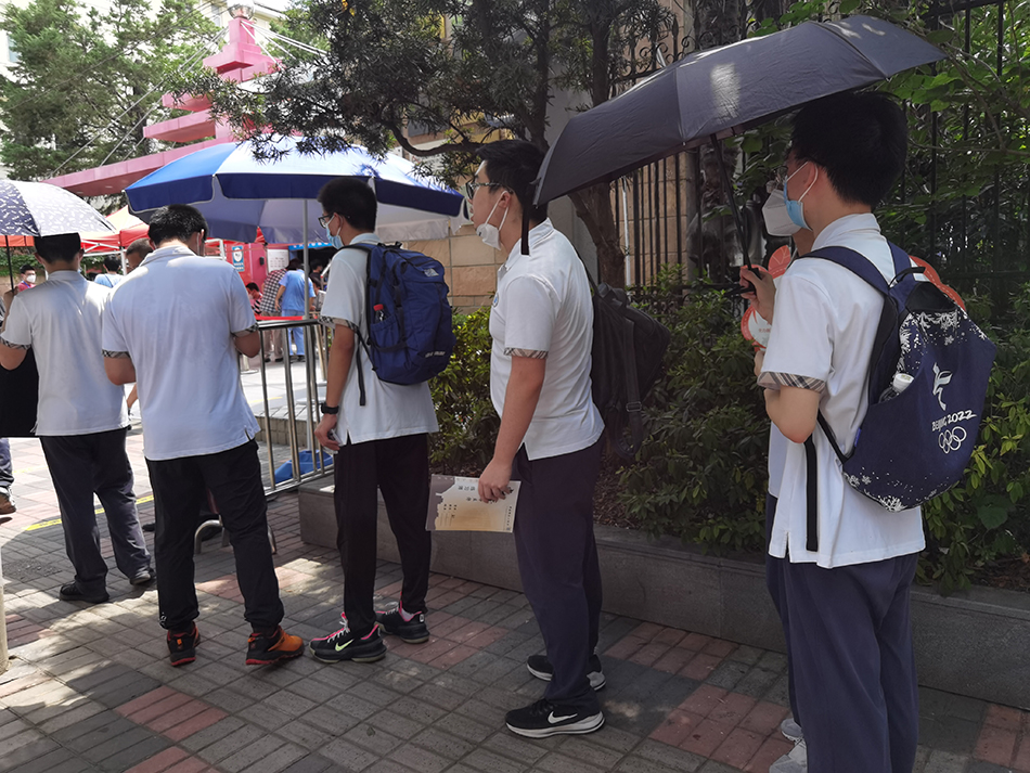 在考点外等候时,家长林先生身穿红色T恤,手持黄色折扇给女儿扇风降温,林同学表示,今天下午心情挺轻松,“我的外语成绩还可以,希望这一次考试能比春考时高一些。”