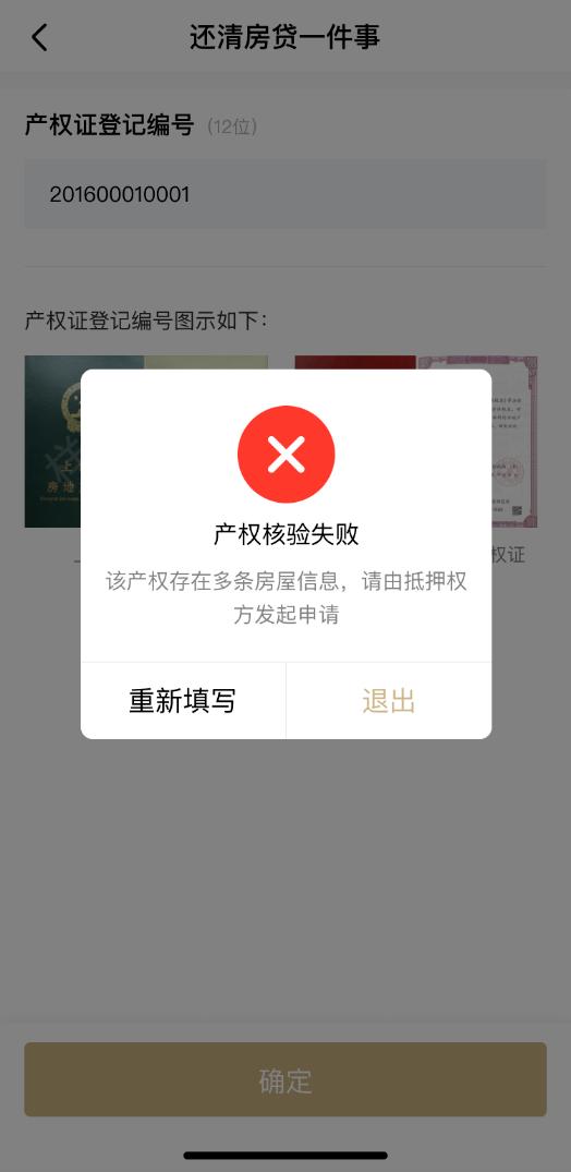 当录入产权信息有误,产权人不匹配,或该产权存在多房屋部位、查封限制等情况时,提示校验失败,需重新录入产权证登记编号或退出操作。