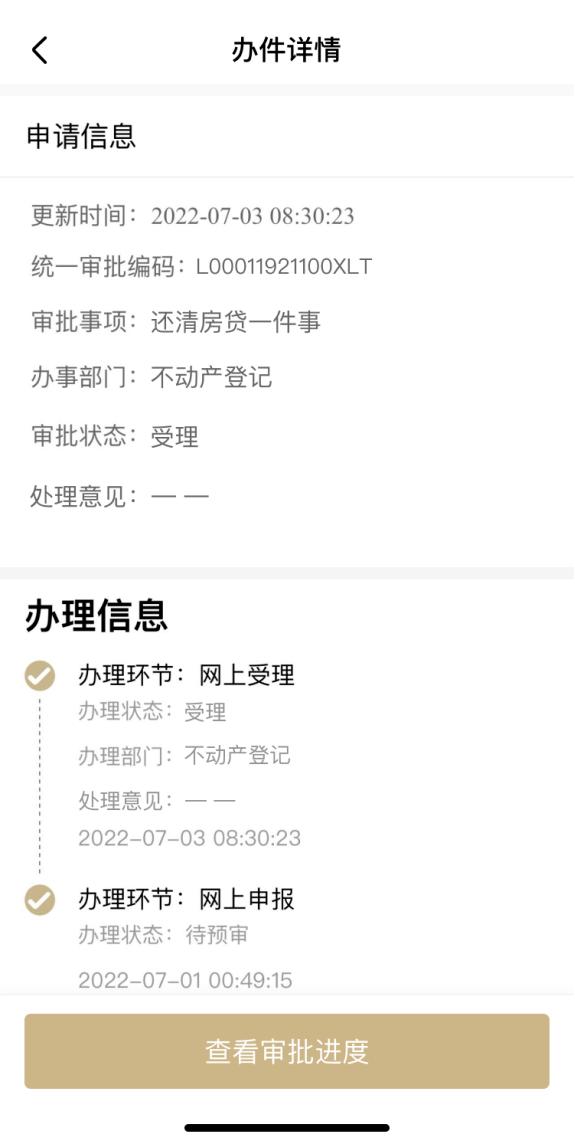涉及公积金贷款的,会对当前抵押贷款公积金还清状态进行校验,当前状态已还清的,在确认公积金信息后,点击【确认提交】即完成申请操作。可点击【我的办件】查看办件进度。