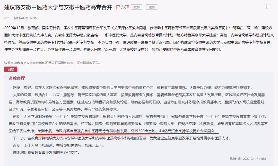 除此之外,2022年3月,安徽省教育厅回复人民网“领导留言”板块网友留言时,还提到:芜湖市委、市政府高度重视安徽中医药高等专科学校发展,划拨320亩土地、4.4亿元资金支持学校提升办学层次。