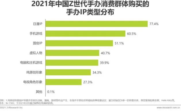 随着二次元游戏在流水和舆论声量上不断进击,玩家对游戏衍生品的消费能力也在变化。根据艾瑞咨询的《2021年中国Z世代手办消费趋势研究报告》,2021年中国Z世代手办消费群体里,手游IP的手办消费者有60.5%,仅次于日漫IP。
