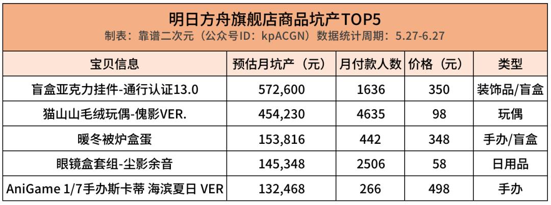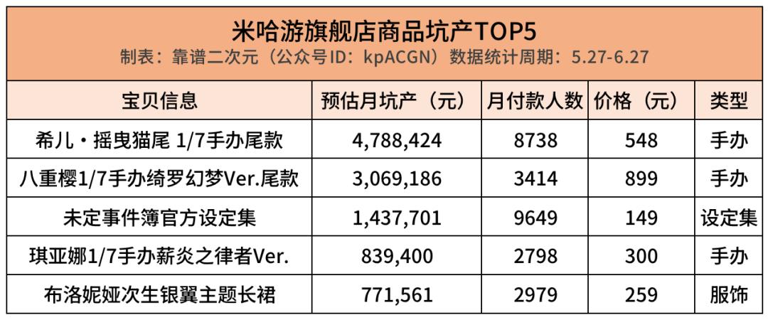 具体来看每个店铺的月坑产TOP5商品,能发现更多规律。米哈游旗舰店多为手办产品,平均价格为431元,付款人数平均为5515人。