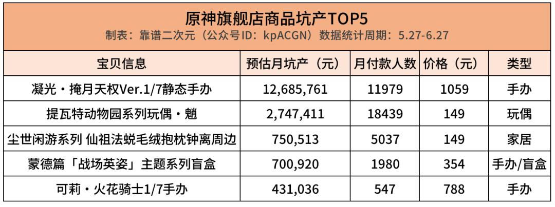 原神旗舰店里月坑产TOP5的商品同样手办类居多,其他2款产品为玩偶和抱枕。价格平均为499.8元,付款人数平均7596人。
