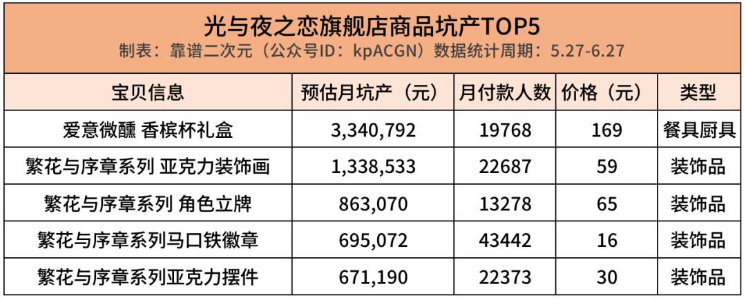 光与夜之恋旗舰店的TOP5月坑产商品除了香槟杯礼盒,其余为亚克力装饰画、摆件及角色立牌和徽章类装饰品。付款人数平均为24309人,单价平均为67.8元。