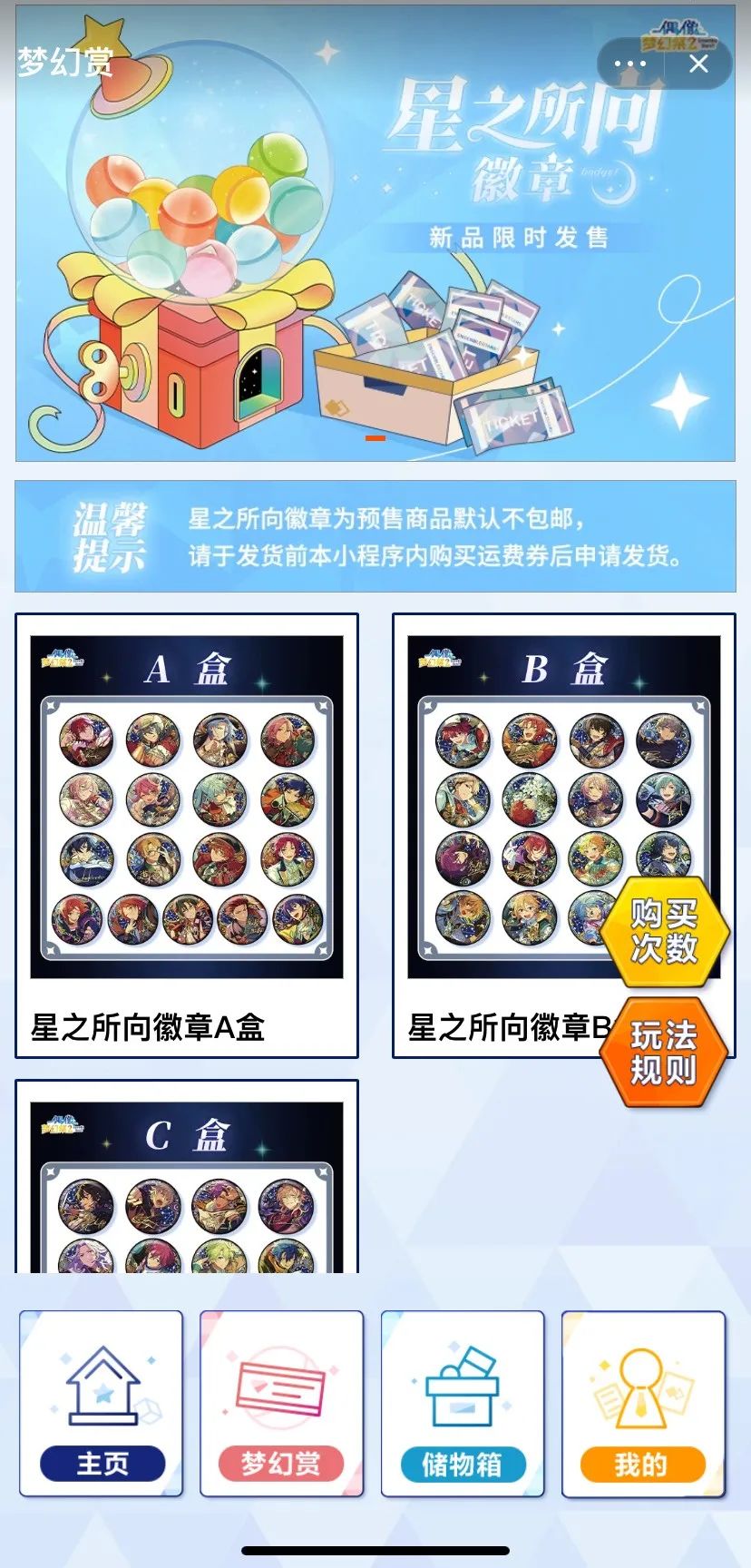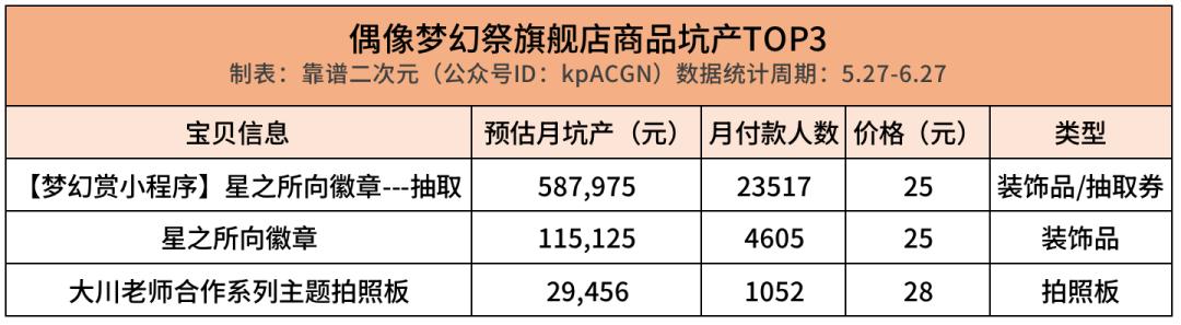 偶像梦幻祭旗舰店较为特殊,坑产最高的为周边徽章的抽奖券。徽章类商品只开放A盒的周边徽章预售,而抽奖券可以抽取A盒、B盒、C盒三种类型的徽章,因此吸引了当月2w人的付款。该店铺没有长线上架的商品,而是预售一段时间售罄后下架,下一批周边好了再开启新一轮预售的策略。