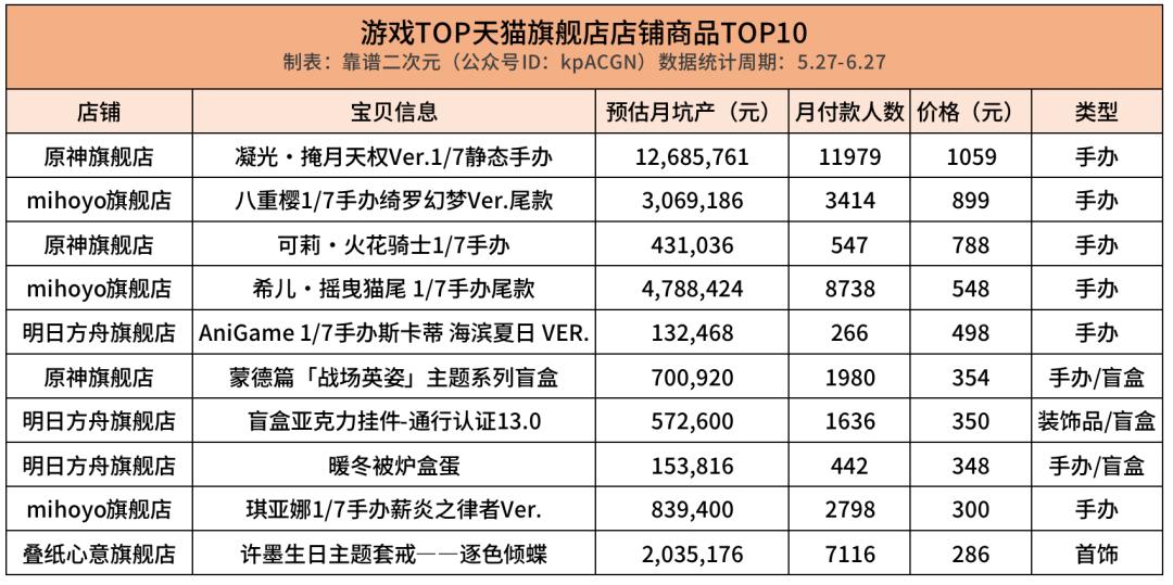 6家店铺月坑产最高的产品分别是,米哈游的希儿手办,叠纸《恋与制作人》的主题套戒,《光与夜之恋》的香槟杯礼盒,《明日方舟》的亚克力挂件,《原神》的凝光手办,《偶像梦幻祭》的徽章抽奖券。产品类型有手办装饰品,也有首饰、餐具厨具,价格和付款人数数据方差较大,既有25元的抽奖券也有1059元的手办,体现了游戏周边的多元性。