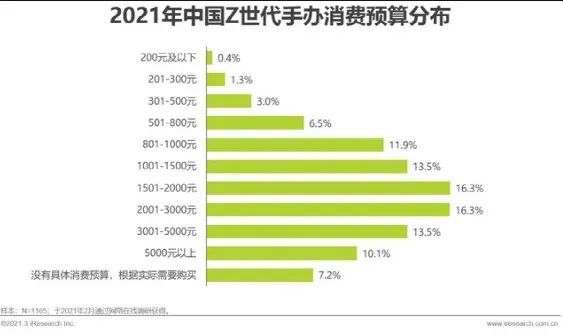 根据艾瑞的《2021年中国Z世代手办消费趋势研究报告》显示,2021年Z世代用户的手办消费预算里,占比最多的是1501-2000元,以及2001-3000元,各占16.3%。换算到上面的数据中,意味着32%的Z世代用户最多会在游戏手办里选择2-4款,说明这一品类竞争是比较激烈的。