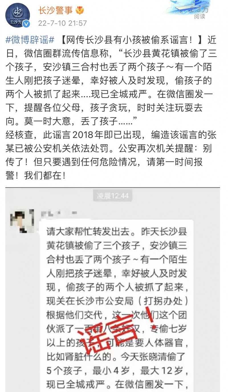近日,微信圈群流传信息称:“长沙县黄花镇被偷了三个孩子,安沙镇三合村也丢了两个孩子。”7月10日晚,长沙市公安局发布信息称,此为谣言,编造谣言者已被警方依法处罚。