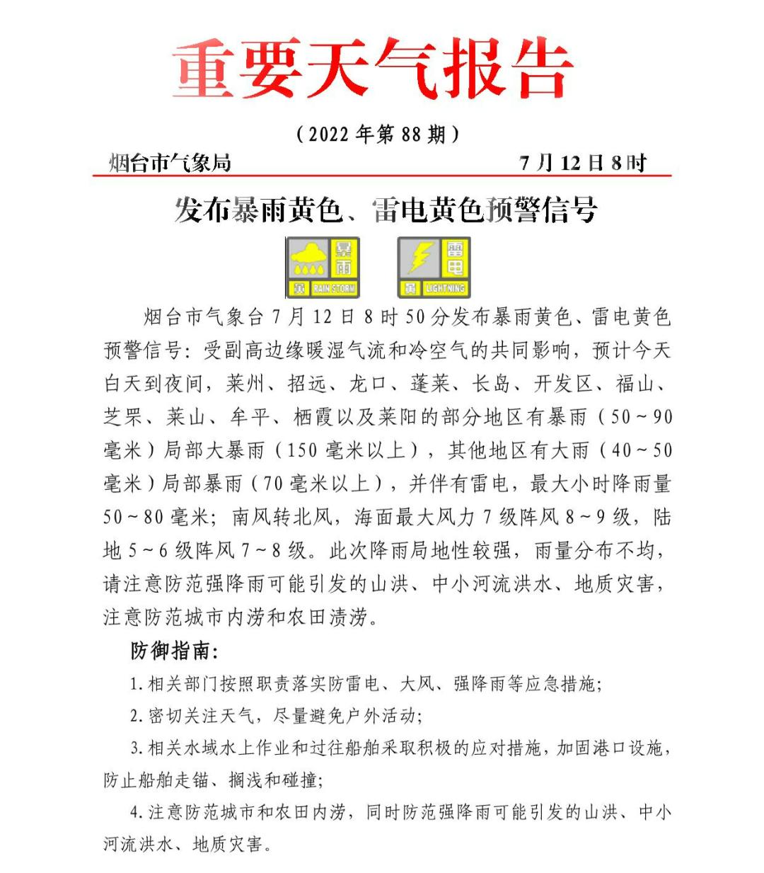 受副高边缘暖湿气流和冷空气的共同影响,预计今天白天到夜间,莱州、招远、龙口、蓬莱、长岛、开发区、福山、芝罘、莱山、牟平、栖霞以及莱阳的部分地区有暴雨(50~90毫米)局部大暴雨(150毫米以上),其他地区有大雨(40~50毫米)局部暴雨(70毫米以上),并伴有雷电,最大小时降雨量50~80毫米;南风转北风,海面最大风力7级阵风8~9级,陆地5~6级阵风7~8级。此次降雨局地性较强,雨量分布不均,请注意防范强降雨可能引发的山洪、中小河流洪水、地质灾害,注意防范城市内涝和农田渍涝。