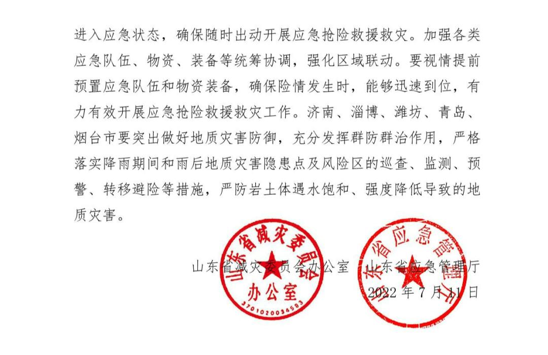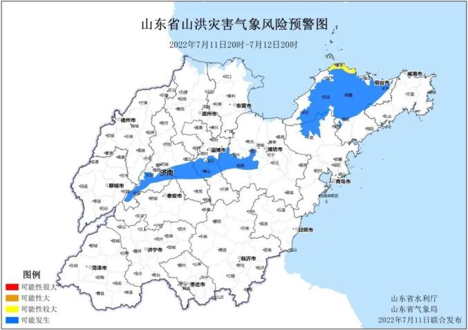 预计7月11日20时至7月12日20时,烟台市局部地区发生山洪灾害的可能性较大(黄色预警),烟台、青岛、威海、济南、泰安、淄博、潍坊等市局部地区可能发生山洪灾害(蓝色预警)。