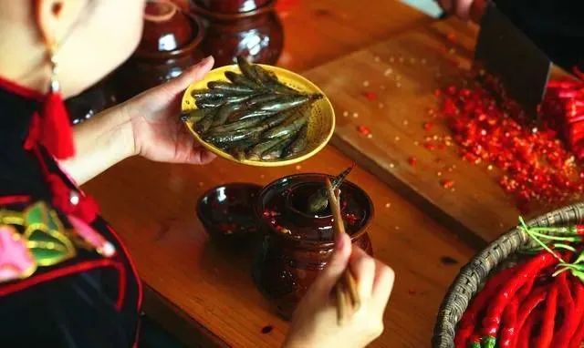 鱼酱的原材料为红辣椒、生姜、木姜子、爬岩鱼,制作时采用苗家传统配方和酿制技艺。一道上好的雷山鱼酱,色泽红艳诱人、酸辣咸香。鱼肉的酱香搭配红辣椒的鲜香,与贵州特有的木姜子的清香融为一体,散发出让人垂涎欲滴的香味。苗家鸡稀饭