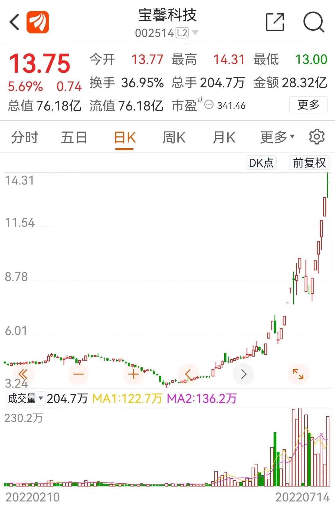 值得注意得是,牛散夫妇举牌时点可谓“精准”,在7月6日公告持股超5%后,7月7日,宝馨科技开启了近期6天5板行情的第一个板。