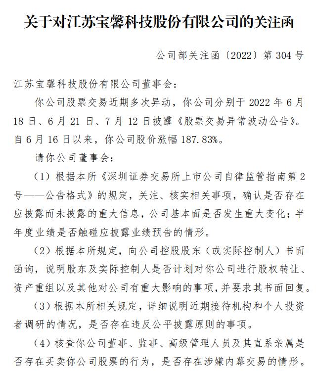 而股价异动也引来监管关注。7月11日晚间,宝馨科技披露,深交所下发关注函,追问公司股价异常大涨,是否存在内幕交易行为、基本面是否发生重大变化等。