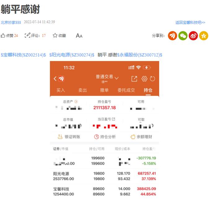 而对于宝馨科技,网友们意见不一。有网友晒单显示,在该股上吃肉了,浮盈44个点。